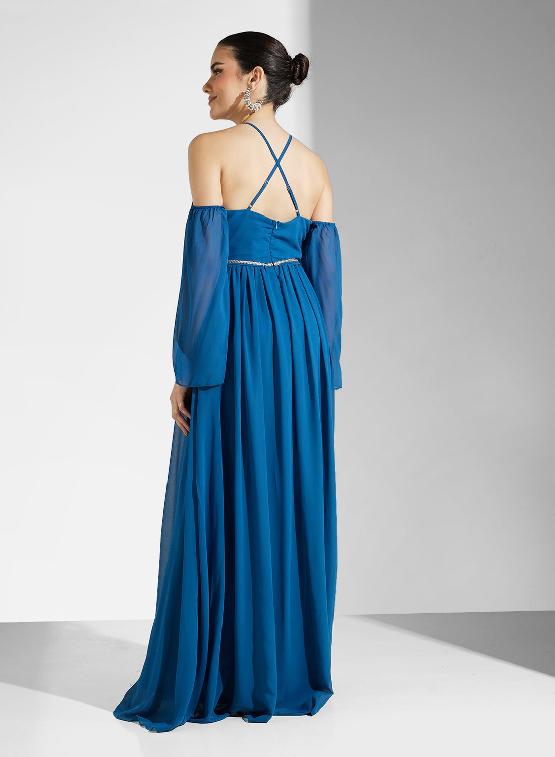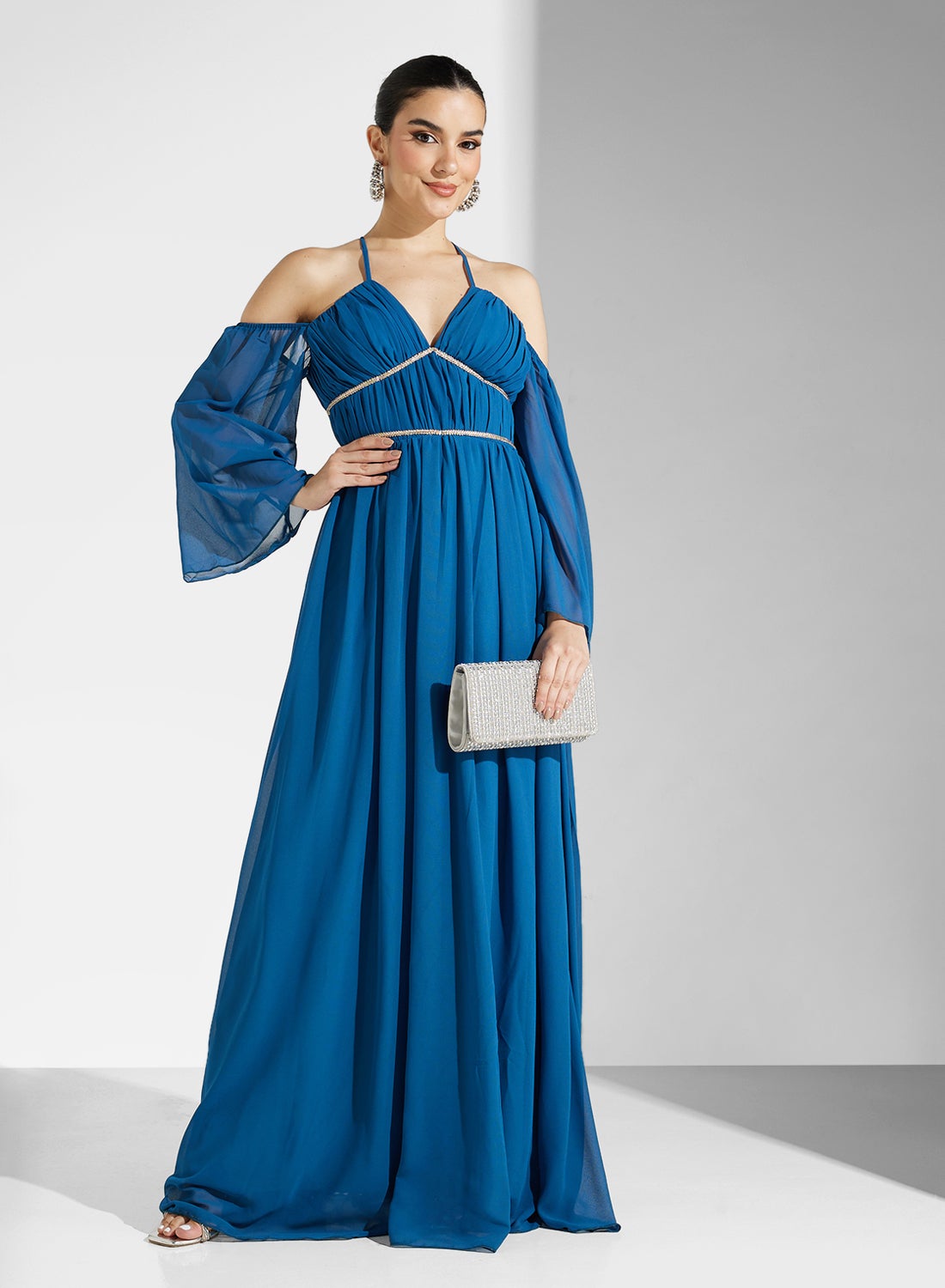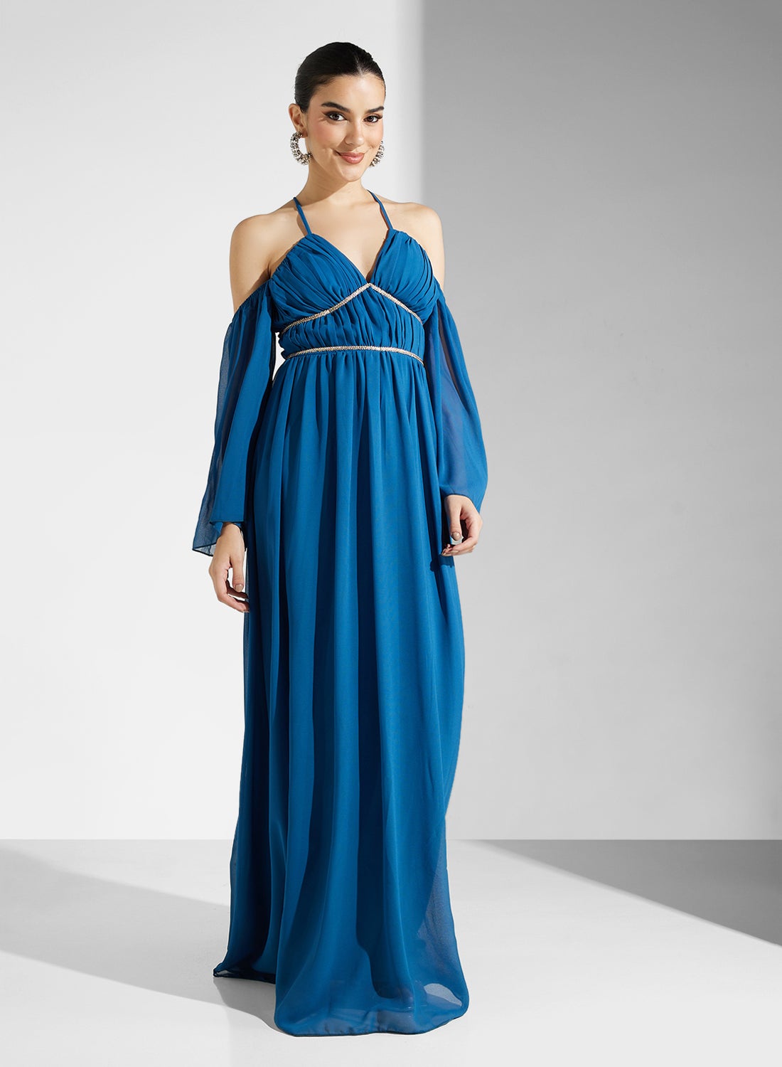 This flowing, full-length dress features a V-neckline and delicate cold-shoulder sleeves in lightweight chiffon. The flattering silhouette is cinched with a subtle band at the waist. رقم التصميم: Al4245 الستايل : المساء بلد المنشأ : الصين اللون: أزرق طول الفستان/التنورة: طويل الجنس: أنثى نوع الرقبة: رقبة على شكل حرف V نوع الكم: كم طويل النمط: سادة Namshi Washing Instructions: Dry Clean ستايل الملابس: فيت أند فلير