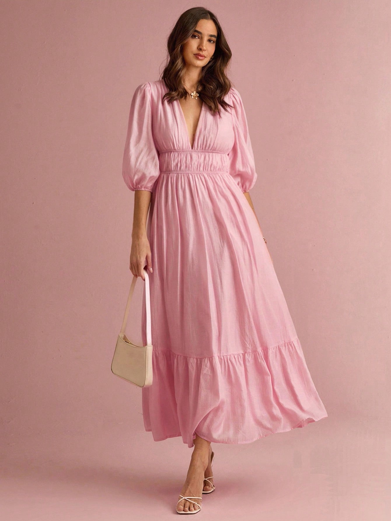 فستان نسائي أنيق بأكمام فانوس طويلة باللون الأحادي، صيفي